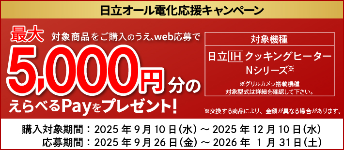 日立オール電化キャンペーン(IHクッキングヒーター)最大5,000円分のえらべるPayプレゼント! >