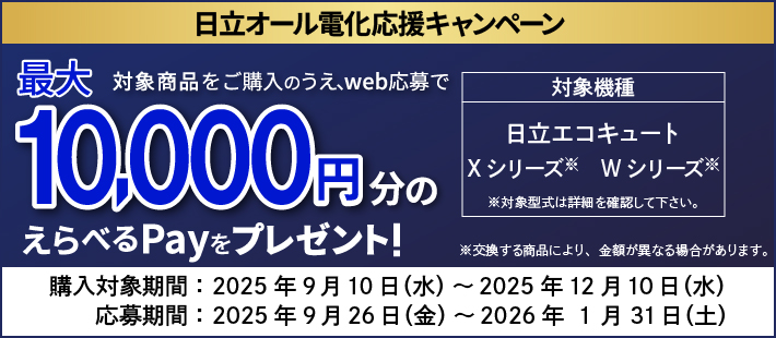 日立オール電化キャンペーン(エコキュート)最大10,000円分のえらべるPayプレゼント! >