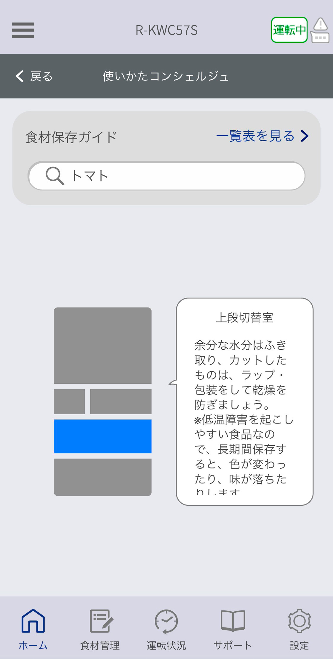 保存したい食材名を検索すると、おすすめの保存場所や保存方法を、ご使用の冷蔵庫の設定にあわせてご案内します。