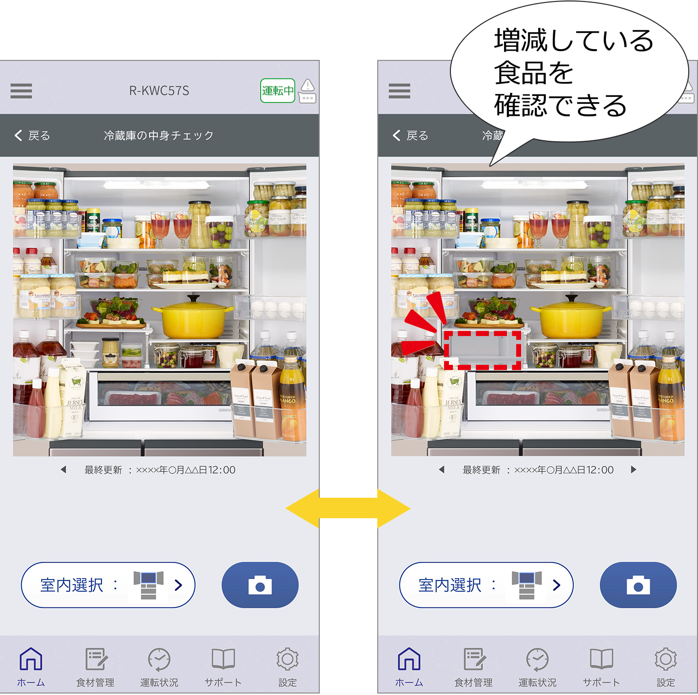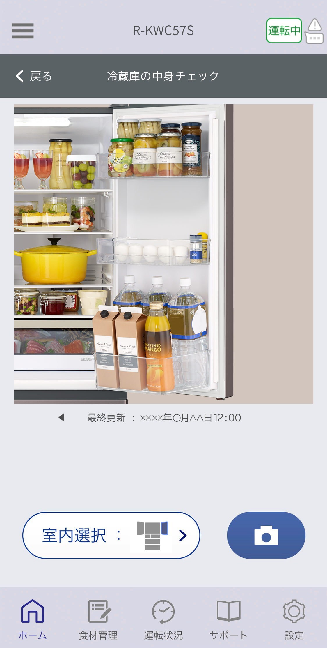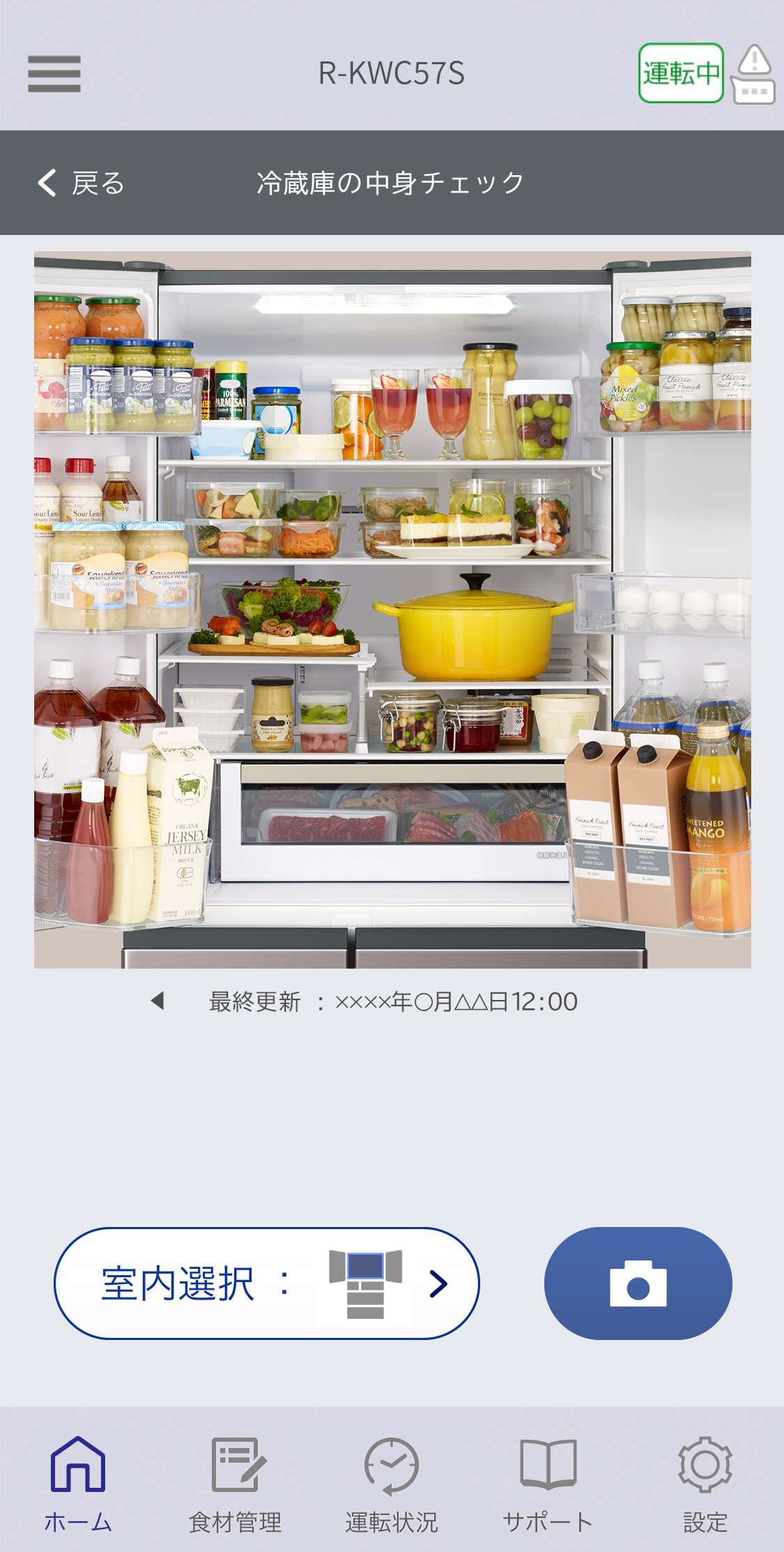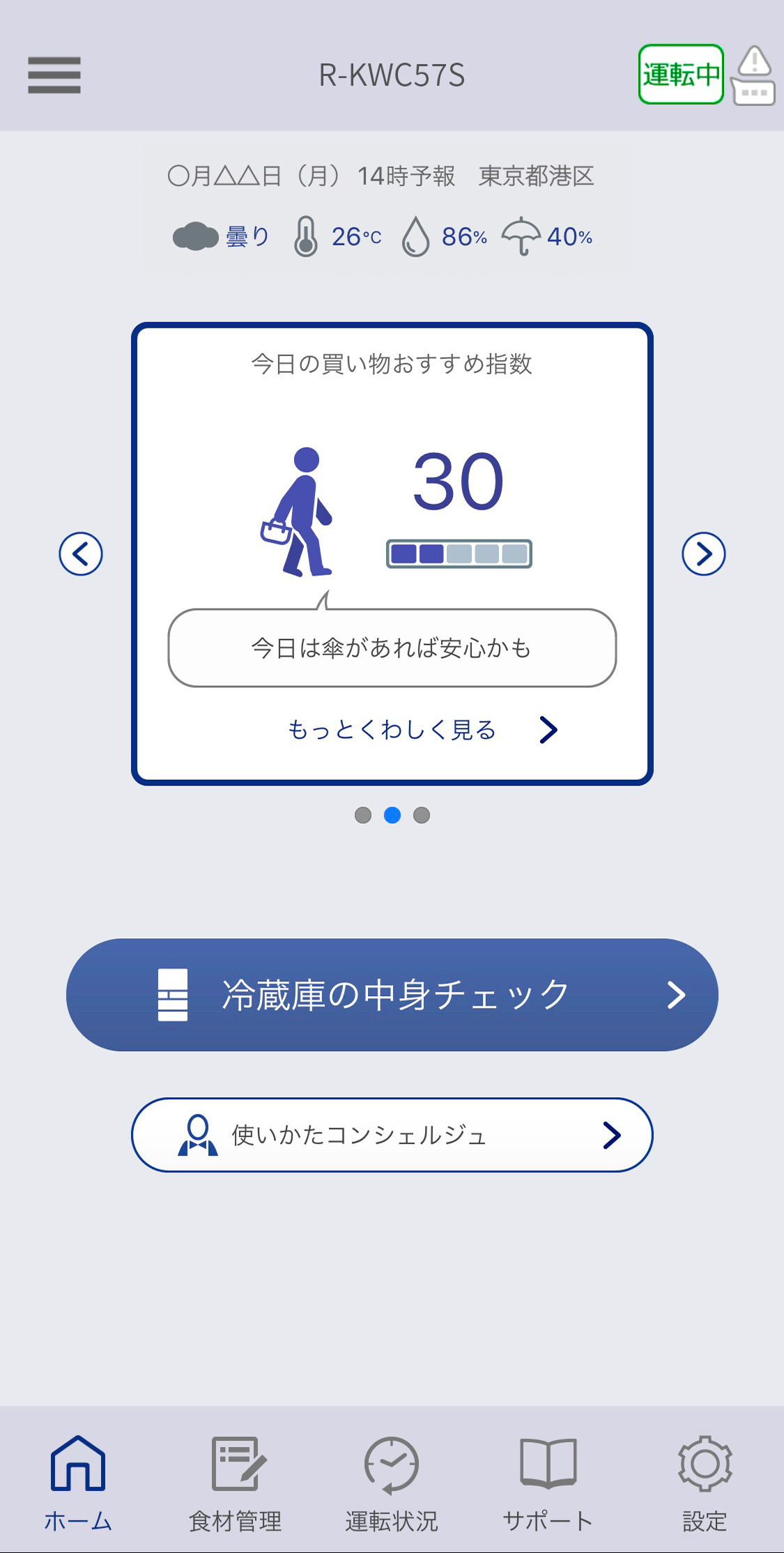 季節に合わせた「旬の食材」情報や、天気予報に合わせて買い物に出かけるおすすめ度を表示する「買い物おすすめ指数」、「冷蔵庫の運転状況」などをお知らせします。