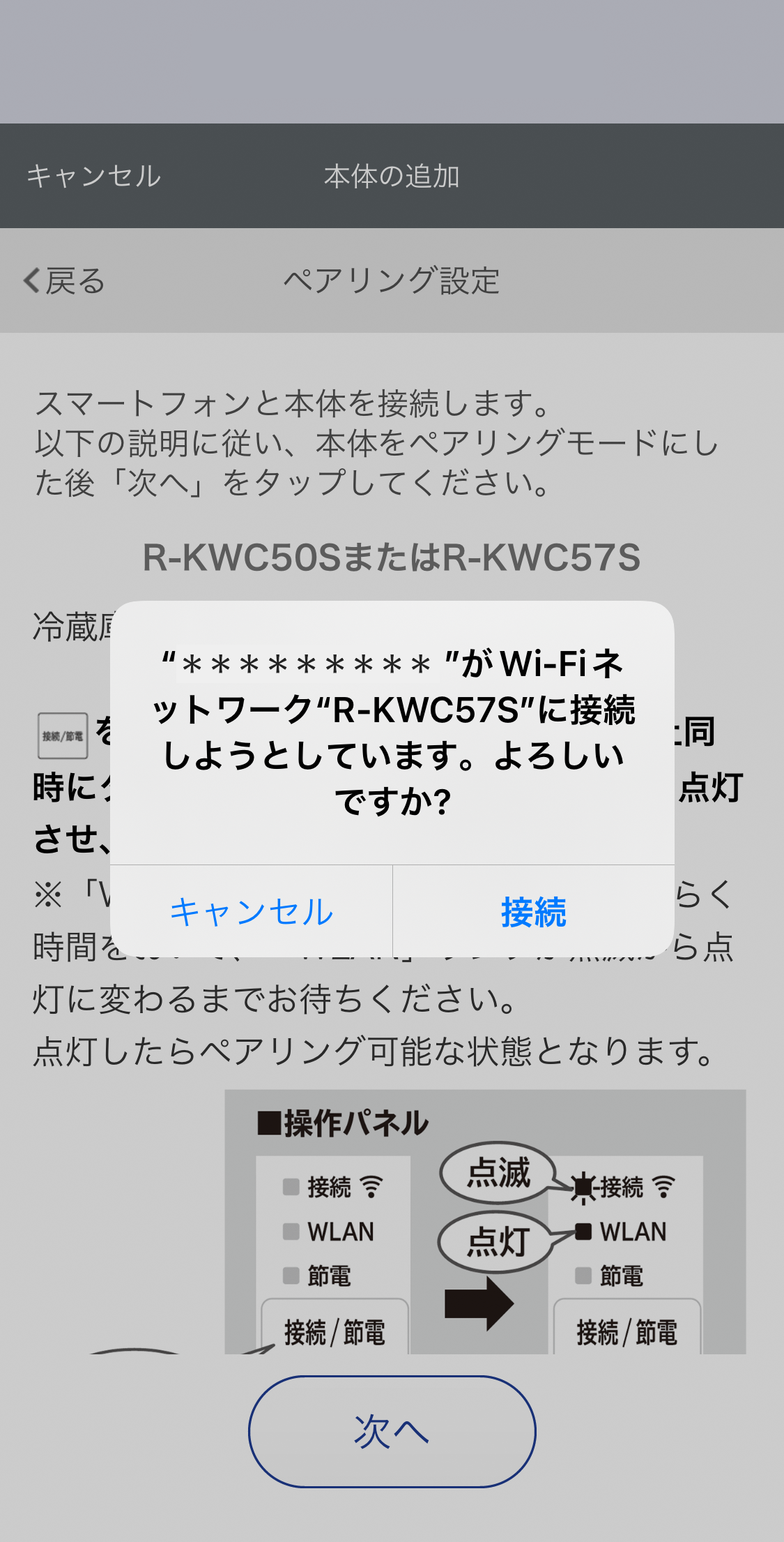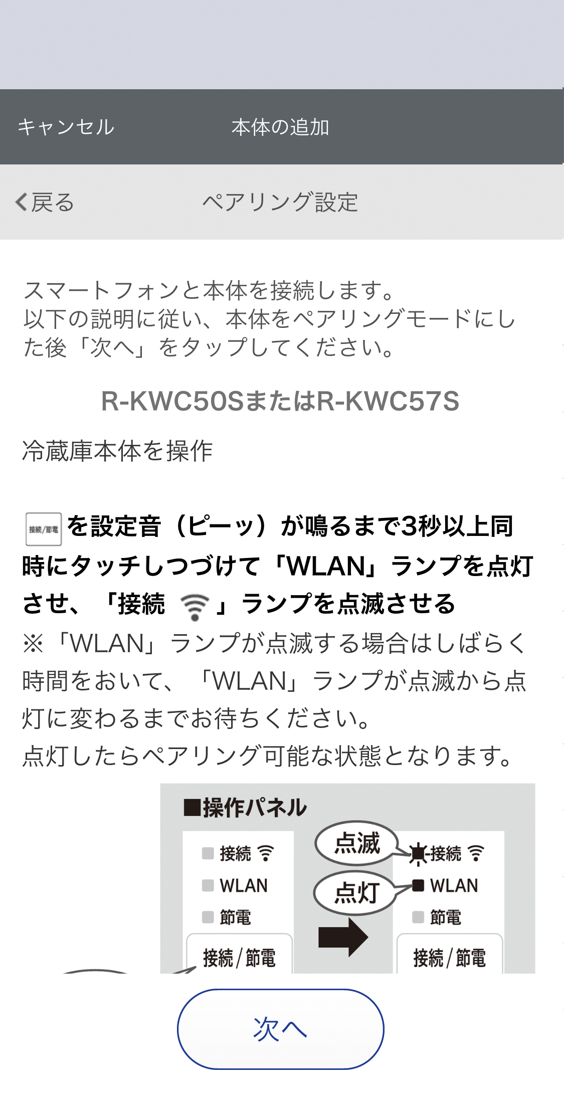 4.アプリ画面にしたがって、冷蔵庫本体をペアリングモードに設定します。