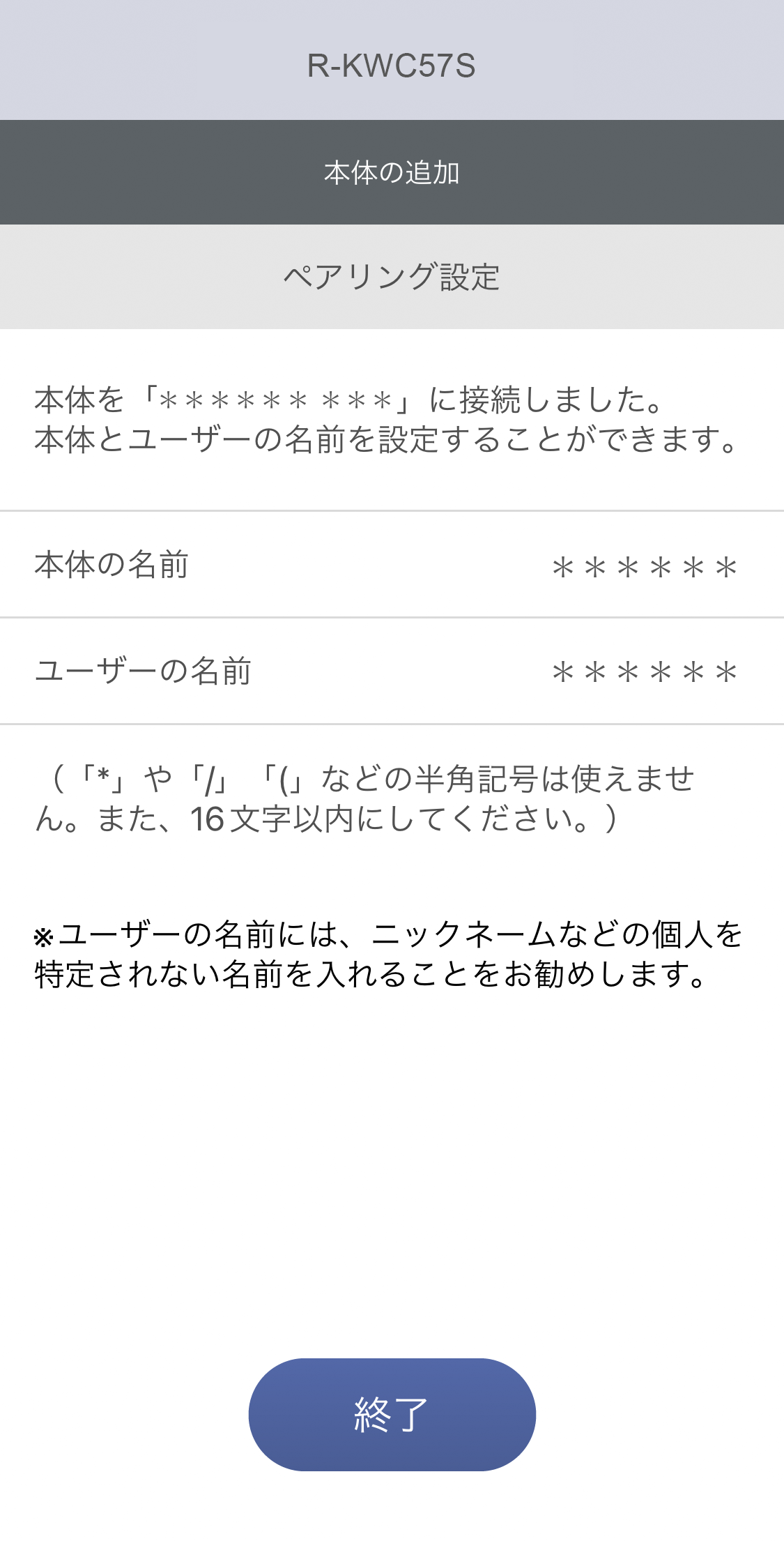 8. 冷蔵庫本体とユーザーの名前を設定します。