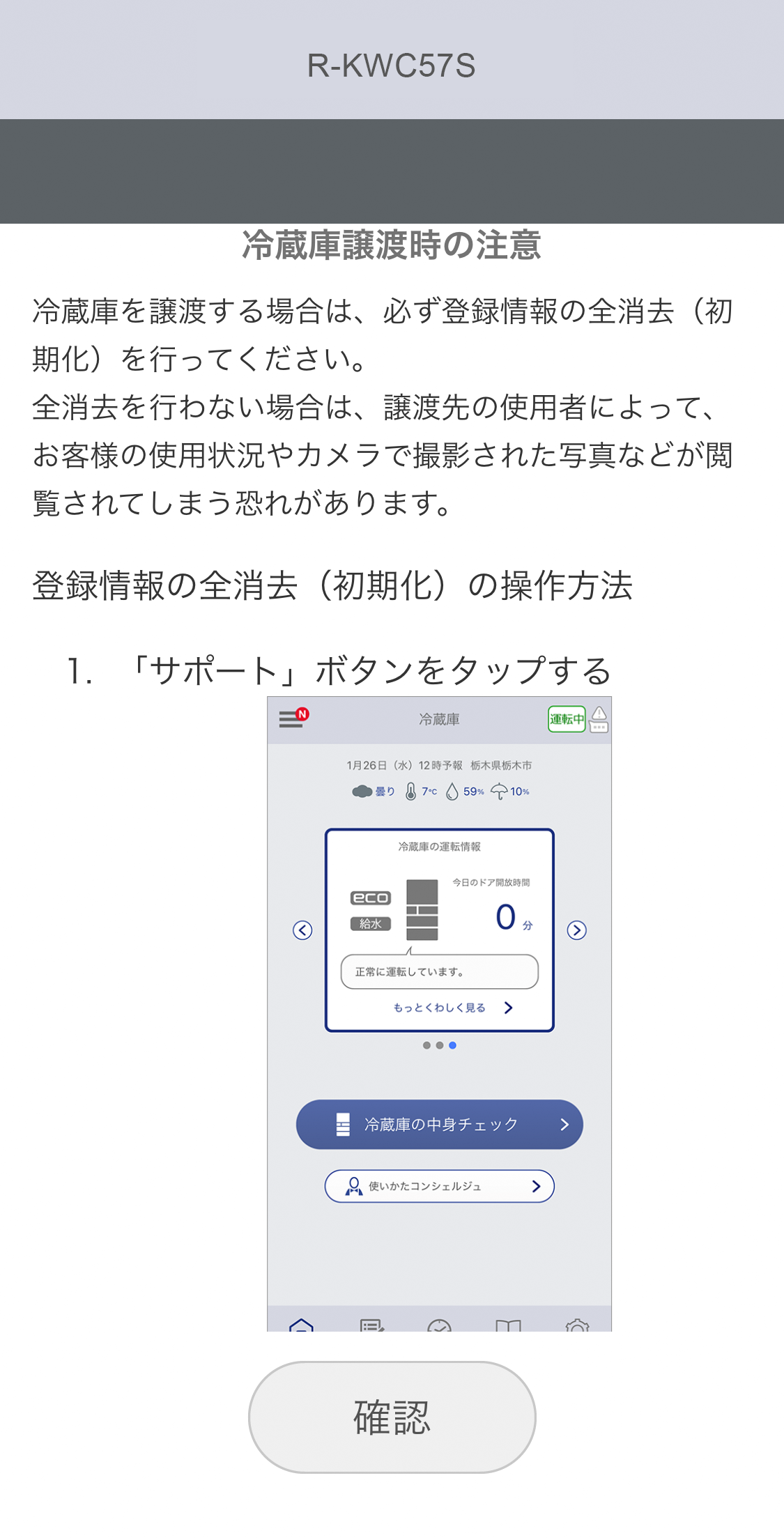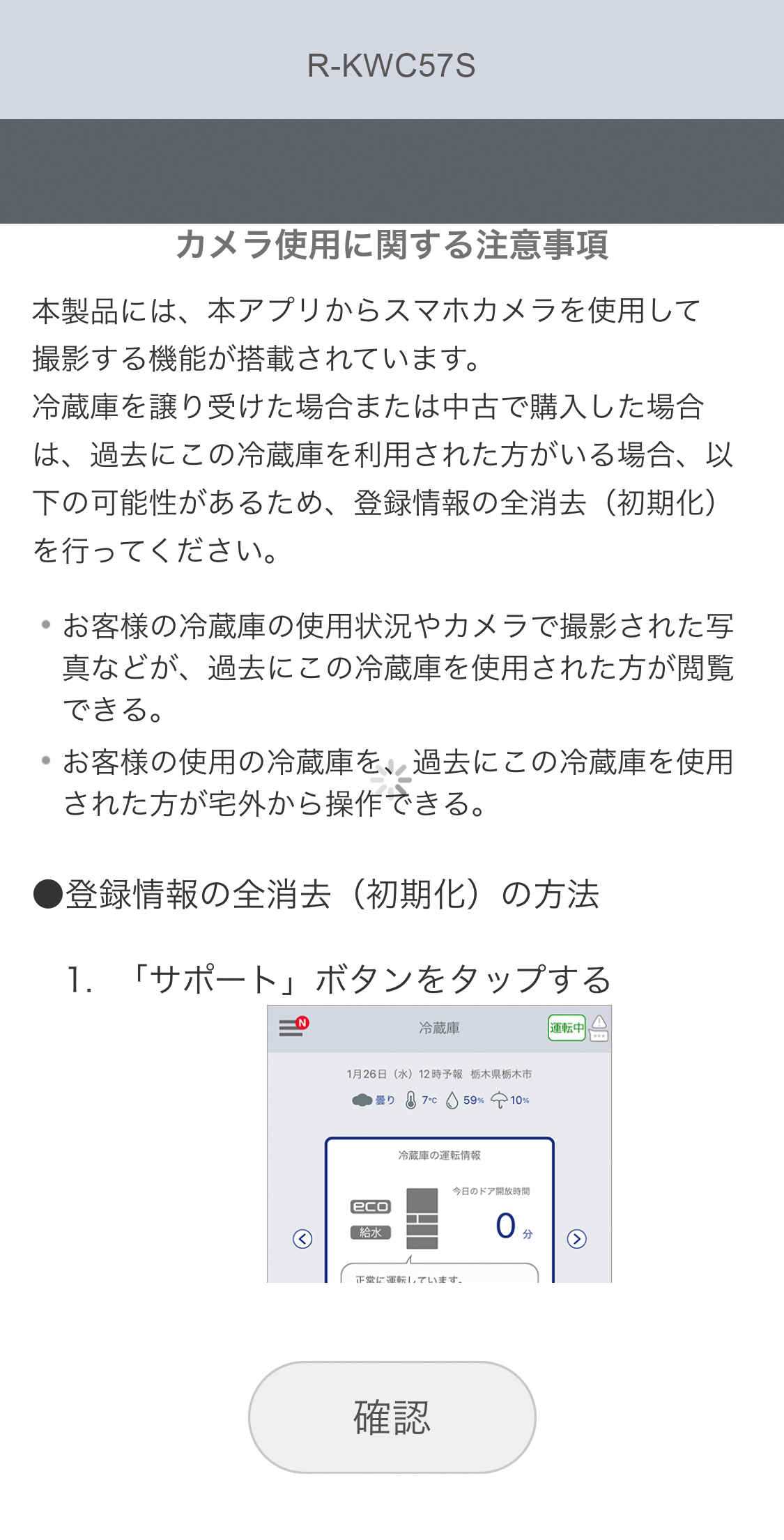 9.「冷蔵庫譲渡時の注意」と「カメラ使用に関する注意事項」が表示されるため、それぞれページをスクロールして最後まで内容を確認いただき、ボタンが押せる状態になったら「確認」をタップします。