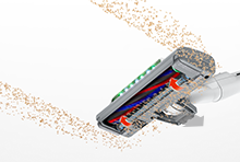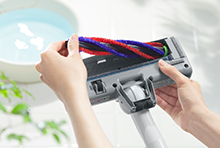 おうちのいろんな場所をラクにキレイにできるように。さまざまなツールからお手入れまで、使う人にうれしいこだわりが詰まった一台です。回転ブラシは髪の毛などがからまりにくく、水洗いができます。