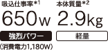 *1 吸込仕事率とは、JIS規格に定められている吸込力の目安で、最大を表示しています。使用時の吸塵力は吸込仕事率以外に吸込具の種類・ごみのたまり具合や床材の違い等によって異なります。お掃除の際は、ふさわしいポジション(運転モード)をお選びください。