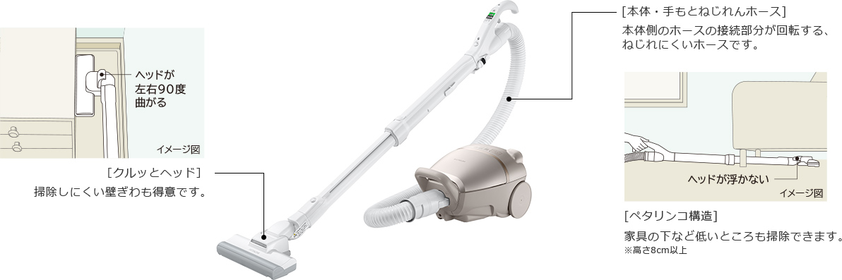 *1 【試験方法】人毛(長さ約30cm)0.25gを3畳のフローリングにランダムにまき、強運転で吸引する。これを10サイクル行う。【試験結果】 回転部のブラシへのからみつく毛量(からみ質量比)が1サイクルにつき5%以下。