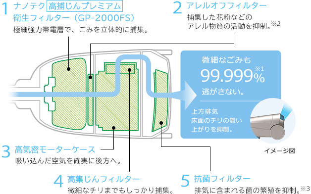 高集じんフィルターと高気密モーターケースなどによって、 微細なごみも捕集し、排気をきれいにします。