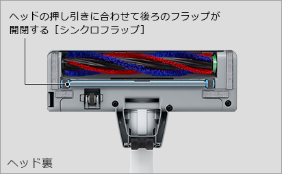 ヘッドの押し引きに合わせて後ろのフラップが開閉する[シンクロフラップ]を採用。ヘッド内の圧力を調整してヘッドが床にはりつくのを抑えるので、取り回しやすく、引くときもごみを吸い込みます。