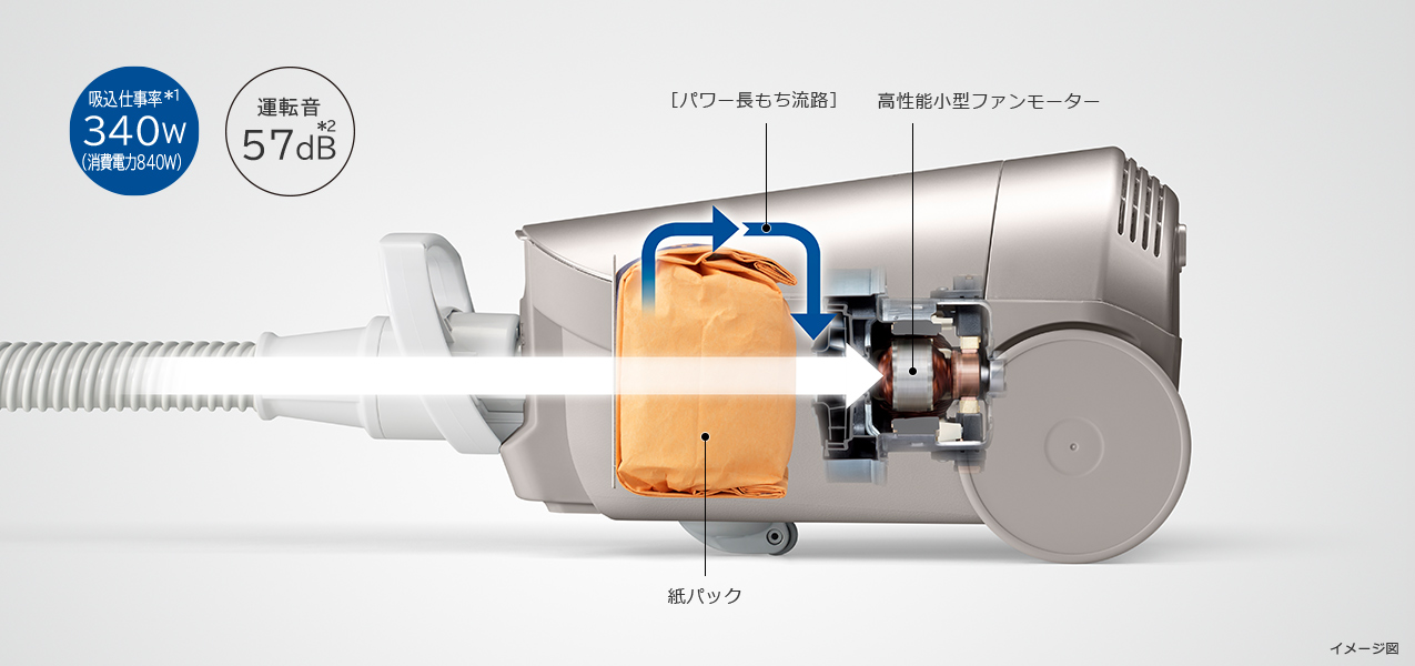 高性能小型ファンモーターを搭載し、さらにごみがたまってきても[パワー長もち流路]でパワーが長もちします。