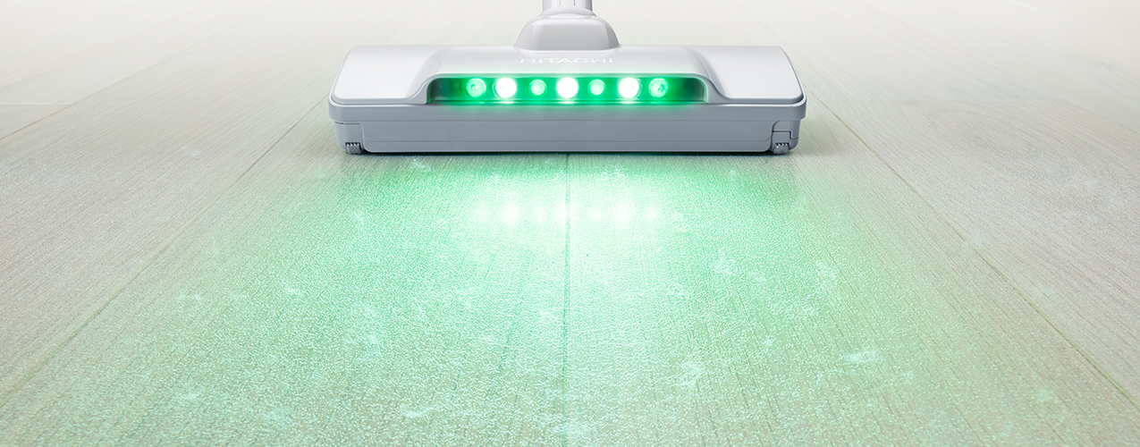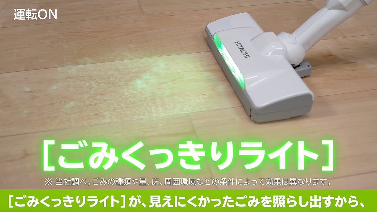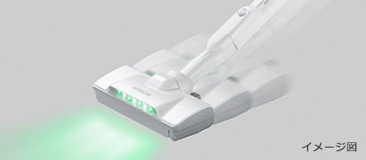 白色に加え、緑色のLEDライトを採用。緑色はもっとも明るく感じる波長に近く、照らされたごみとごみの影の明暗の差(コントラスト)が大きくなるため、ごみが見えやすくなります。さらに、合計7灯の光を効率的に集める設計のレンズで前方を照らします。これにより、暗いところはもちろん明るいところでも、見えにくかったごみを浮かび上がらせます。