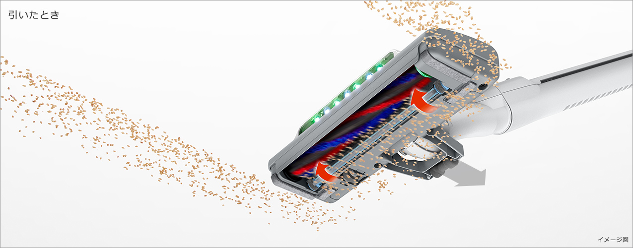 回転ブラシをヘッドの前側に近づけて配置することで、壁ぎわのごみもスッキリ。