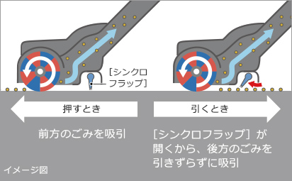 ヘッドの押し引きに合わせて後ろのフラップが開閉する[シンクロフラップ]を採用。ヘッド内の圧力を調整してヘッドが床にはりつくのを抑えるので、取り回しやすく、引くときもごみを吸い込みます。