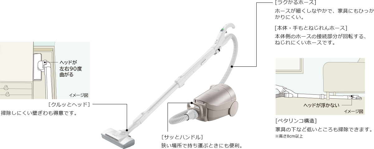 ホースが細くしなやかで、家具にもひっかかりにくい。