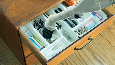引き出しの中やサッシの溝、カーテンなど、掃きながらキレイに。チューブ状の吸込口で、クリップなどの小物を吸わずにごみを吸引できます。