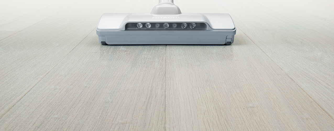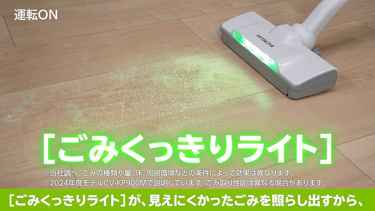 日立はLEDライトにもっとも明るく感じる波長に近い「緑色」を採用。合計7灯の光を効率的に集めるレンズで広い範囲をくっきり照らします。暗いところはもちろん明るいところでも、見えにくいごみを浮かび上がらせます。