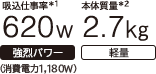 *1 吸込仕事率とは、JIS規格に定められている吸込力の目安で、最大を表示しています。使用時の吸塵力は吸込仕事率以外に吸込具の種類・ごみのたまり具合や床材の違い等によって異なります。お掃除の際は、ふさわしいポジション(運転モード)をお選びください。