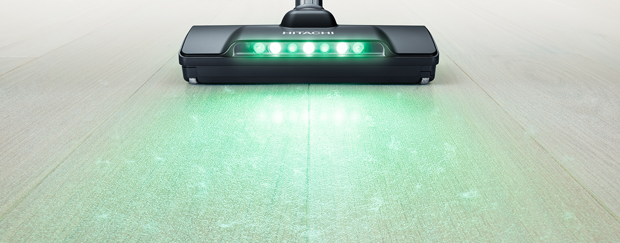 白色に加え、緑色のLEDライトを採用。緑色はもっとも明るく感じる波長に近く、照らされたごみとごみの影の明暗の差(コントラスト)が大きくなるため、ごみが見えやすくなります。さらに、合計7灯の光を効率的に集める設計のレンズで前方を照らします。これにより、暗いところはもちろん明るいところでも、見えにくかったごみを浮かび上がらせます。
