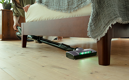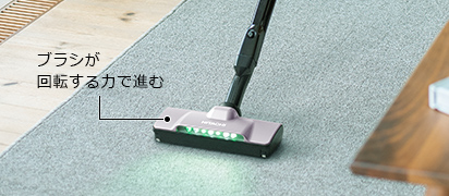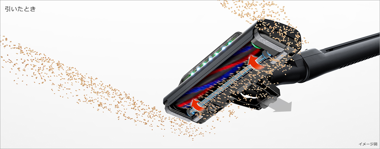 ヘッドの押し引きに合わせて後ろのフラップが開閉する[シンクロフラップ]を採用。ヘッド内の圧力を調整してヘッドが床にはりつくのを抑えるので、取り回しやすく、引くときもごみを吸い込みます。