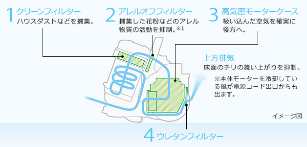 3つのフィルターと高気密モーターケースで微細なごみも捕集します。
