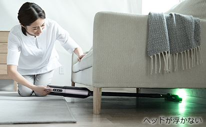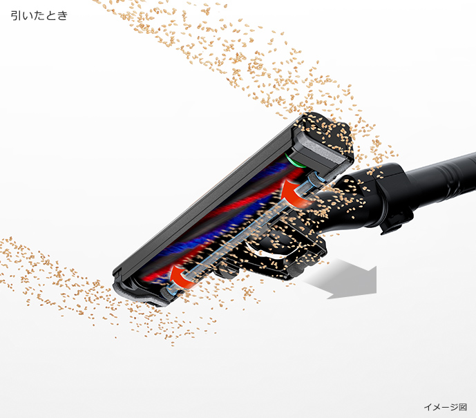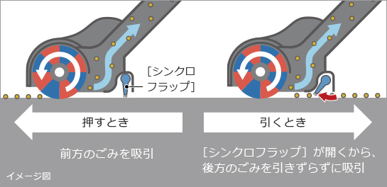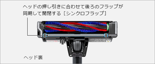 ヘッドの押し引きに合わせて後ろのフラップが同期して開閉する[シンクロフラップ]を採用。ヘッド内の圧力を調整してヘッドが床にはりつくのを抑えるので、取り回しやすく、引くときもごみを吸い込みます。