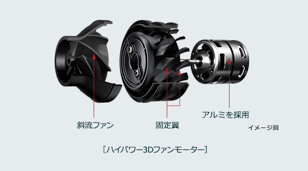 ファンを三次元形状(斜流ファン)にし、後方の固定翼と併せて空気の流れを効率よく制御します。モーターには「極異方4極マグネット」を採用、また素材にアルミを使用することで小型・軽量と強力パワーを実現しました。