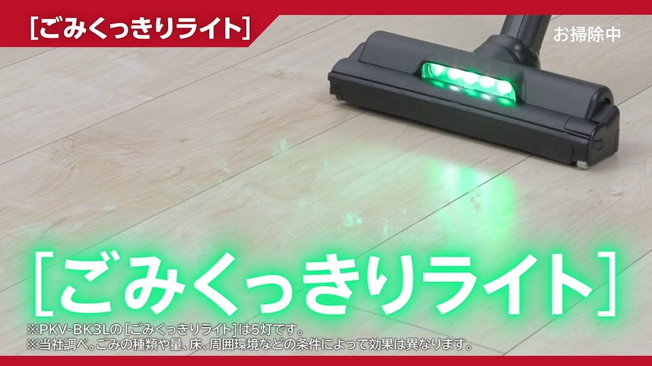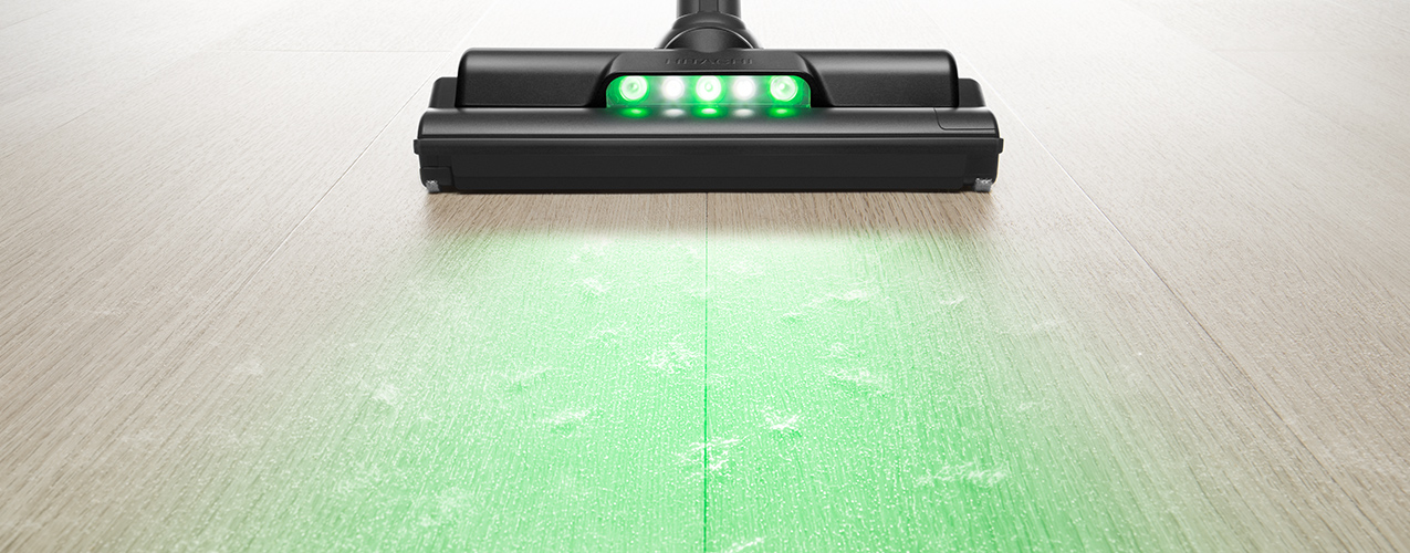 白色に加え、緑色のLEDライトを採用。緑色はもっとも明るく感じる波長に近く、照らされたごみとごみの影の明暗の差(コントラスト)が大きくなるため、ごみが見えやすくなります。さらに、合計5灯の光を効率的に集める設計のレンズで前方を照らします。これにより、暗いところはもちろん明るいところでも、見えにくかったごみを浮かび上がらせます。
