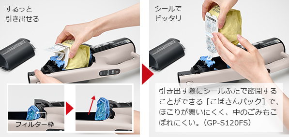 紙パックがごみで満杯に膨らんだ状態でも、フィルター枠がスライドして簡単に取り出せます。