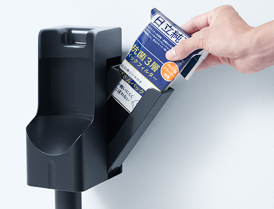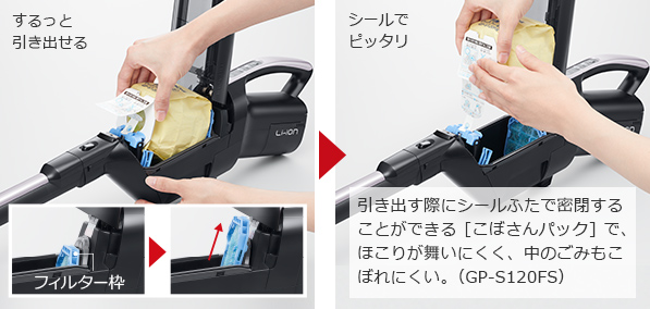 紙パックがごみで満杯に膨らんだ状態でも、フィルター枠がスライドして簡単に取り出せます。