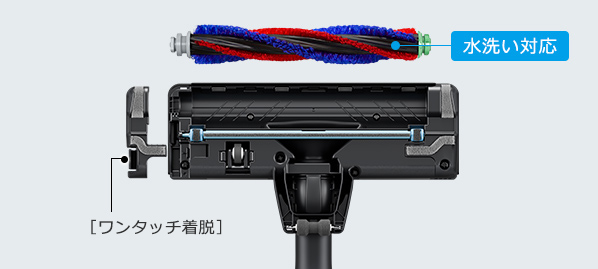 *1 【試験方法】人毛(長さ約30cm)0.25gを3畳のフローリングにランダムにまき、強運転で吸引する。これを10サイクル行う。【試験結果】回転部のブラシへのからみつく毛量(からみ質量比)が1サイクルにつき5%以下。