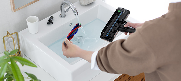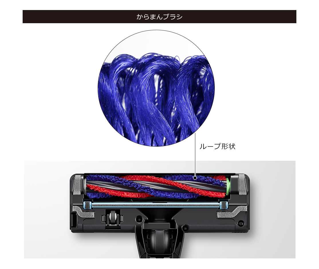 ブラシの先端をループ形状にすることで髪の毛などがからまりにくくなり、スッキリ吸引。お手入れもラクラク。