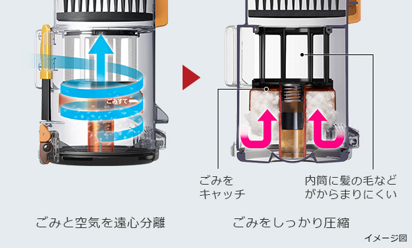 空気の流れを利用してダストケース下部に集めたごみをしっかり圧縮します。ダストケース内の遠心分離の中心となる内筒部分のフィルターに髪の毛などがからまりにくく、お手入れがラク。