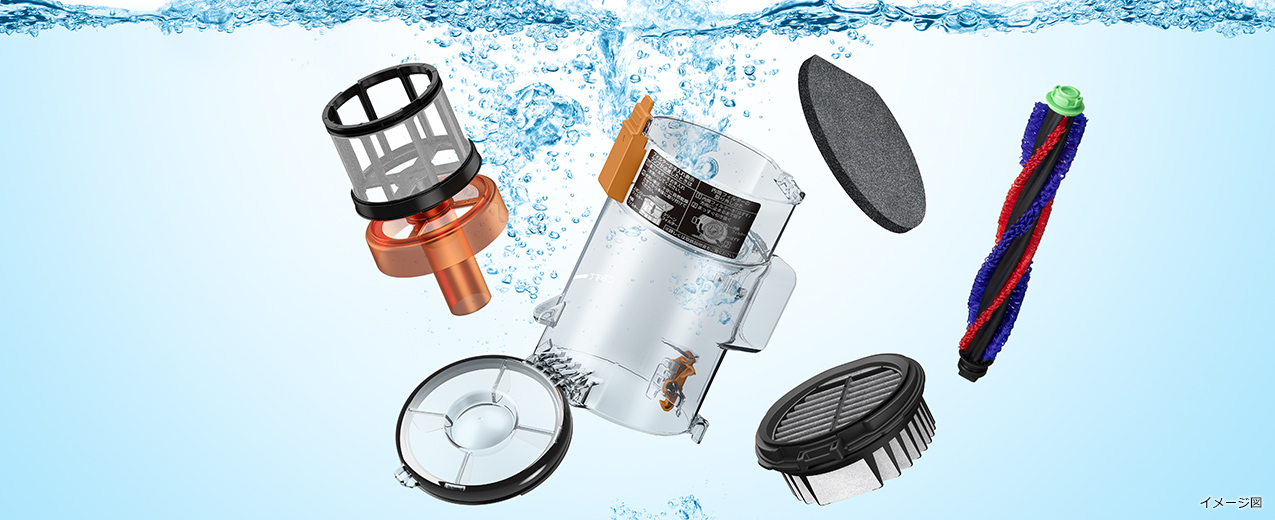 ダストケースは分解でき、水洗い可能。[からまんブラシ]もヘッドから取り外し、水洗いできます。