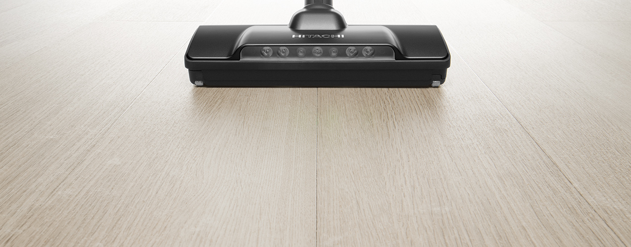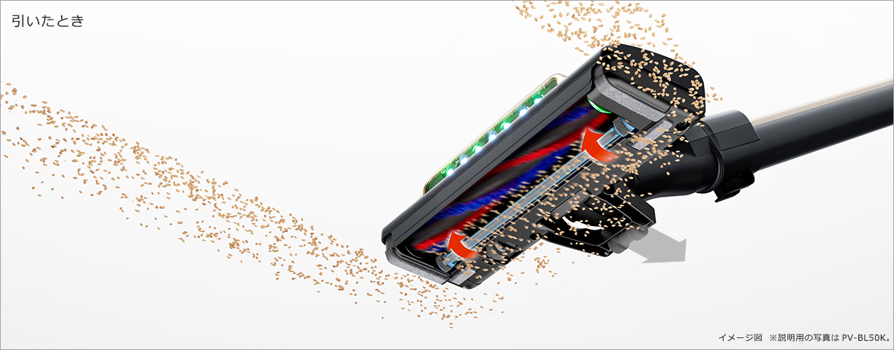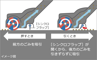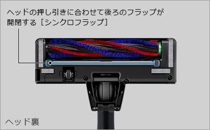 ヘッドの押し引きに合わせて後ろのフラップが開閉する[シンクロフラップ]を採用。ヘッド内の圧力を調整してヘッドが床にはりつくのを抑えるので、取り回しやすく、引くときもごみを吸い込みます。