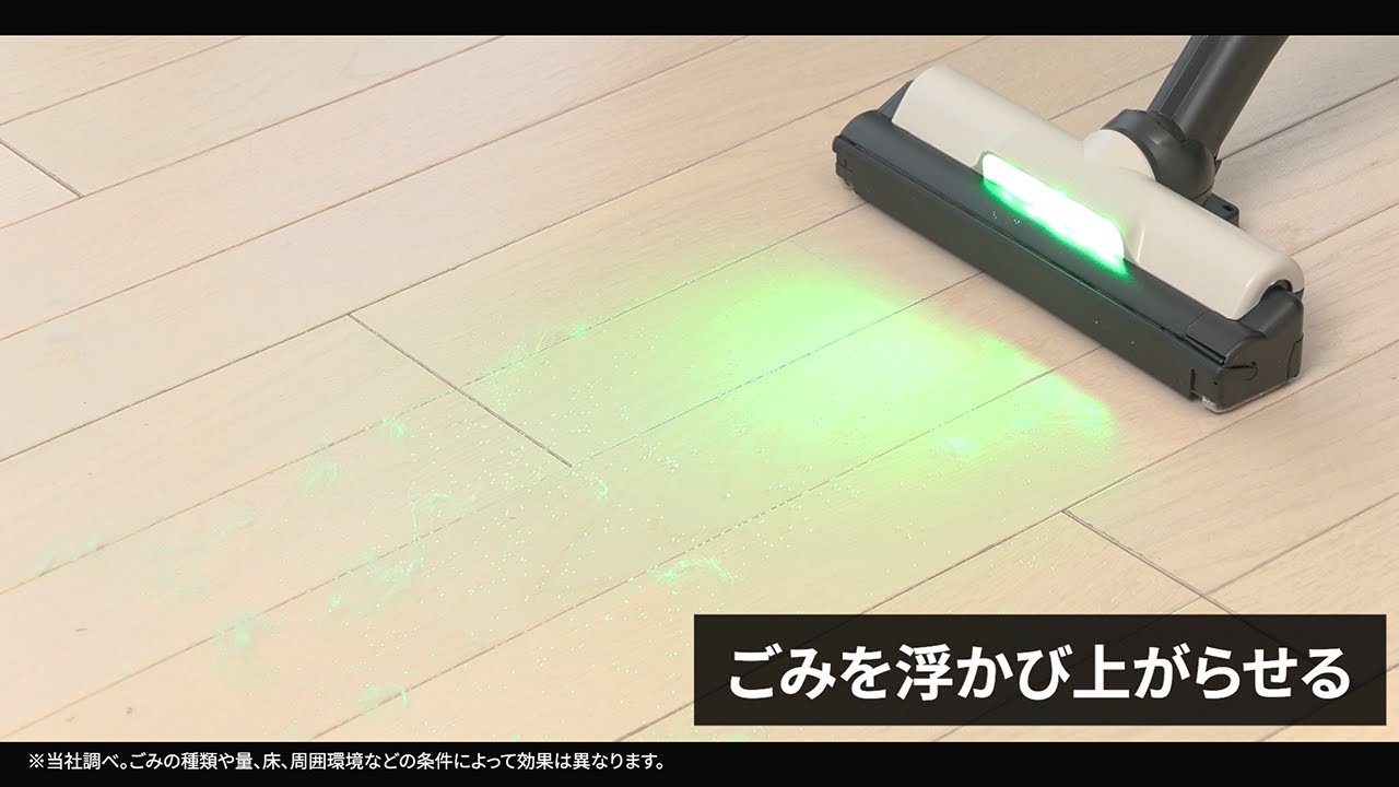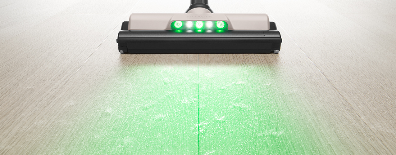 日立はLEDライトにもっとも明るく感じる波長に近い「緑色」を採用。合計5灯の光を効率的に集めるレンズで広い範囲をくっきり照らします。暗いところはもちろん明るいところでも、見えにくいごみを浮かび上がらせます。