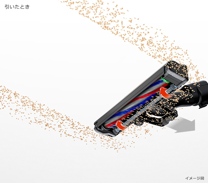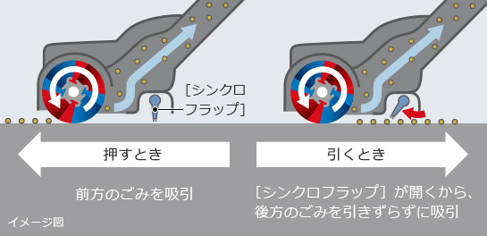 ヘッドの押し引きに合わせて後ろのフラップが同期して開閉する[シンクロフラップ]を採用。ヘッド内の圧力を調整してヘッドが床にはりつくのを抑えるので、取り回しやすく、引くときもごみを吸い込みます。