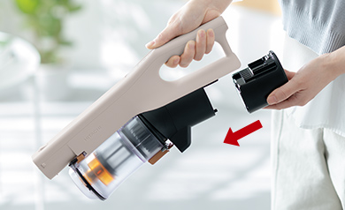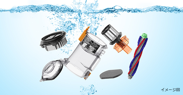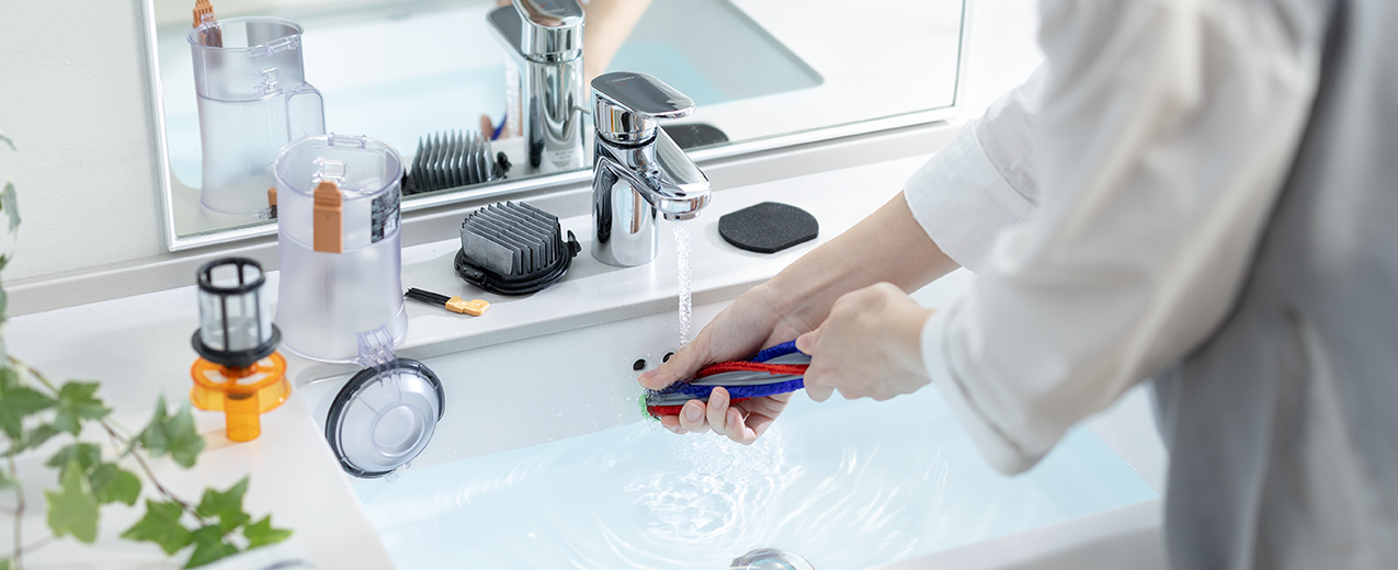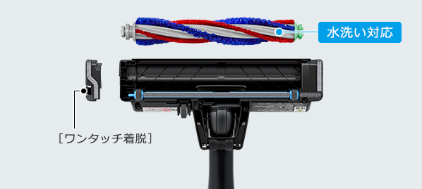 ダストケースは分解でき、水洗い可能。[からまんブラシ]もヘッドから取り外し、水洗いできます。