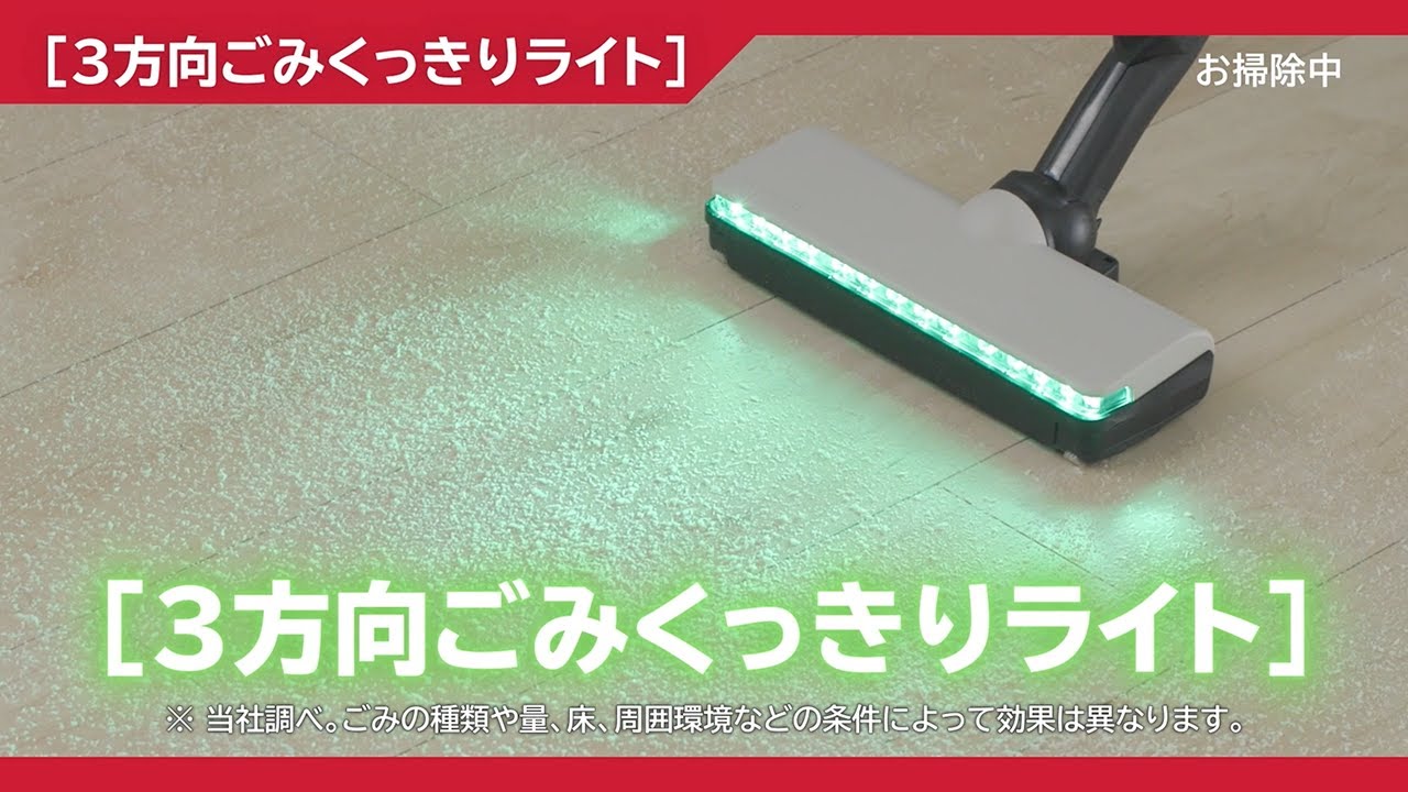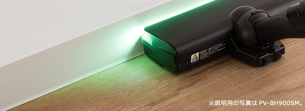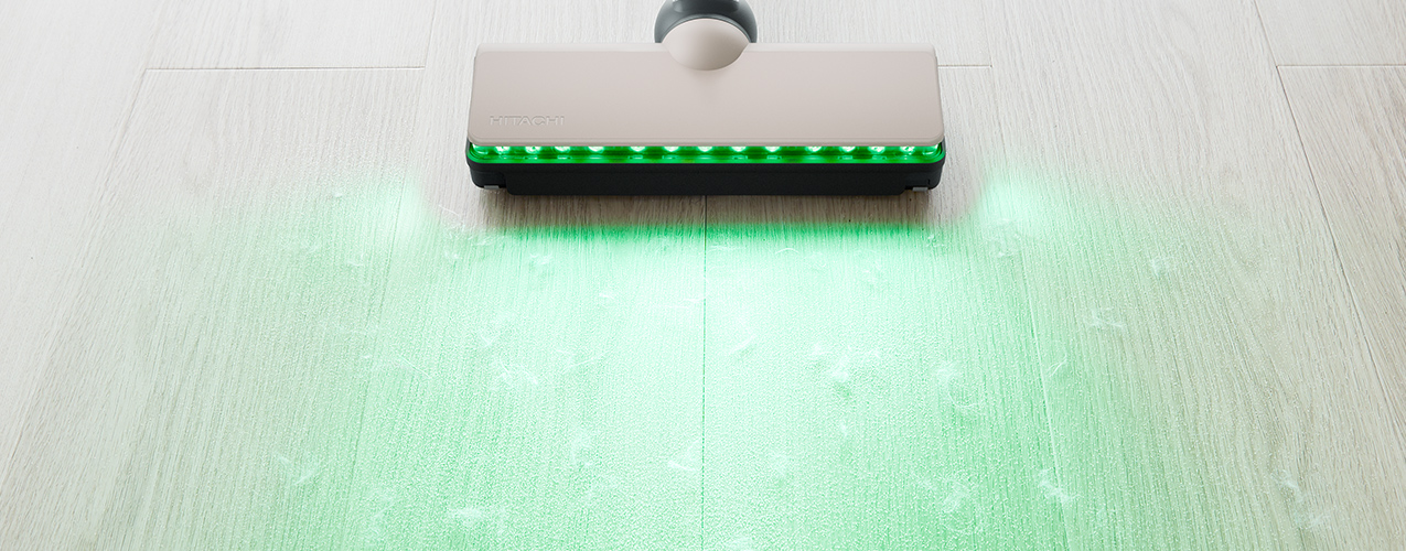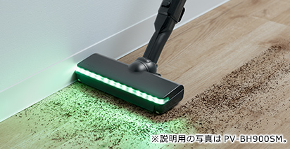 緑色と白色を含むLEDライトを採用。緑色はもっとも明るく感じる波長に近く、照らされたごみとごみの影の明暗の差(コントラスト)が大きくなるため、ごみが見えやすくなります。暗いところはもちろん明るいところでも、見えにくかったごみをくっきり浮かび上がらせます。前方だけでなく左右も照らすので広い範囲が見渡せて、壁ぎわや階段の隅のごみも見つけやすくなります。