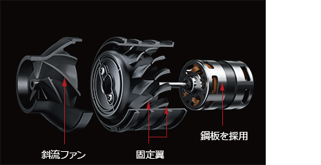 ファンを三次元形状(斜流ファン)にし、後方の固定翼と併せて空気の流れを効率よく制御します。モーターには「極異方4極マグネット」を採用し高効率を実現。さらに、強度を高めた構造にすることで高速回転を可能にしました。これにより従来から風量を約10%※1向上させ、きわだつパワーを実現。小型・軽量ときわだつパワーの両立を実現しました。