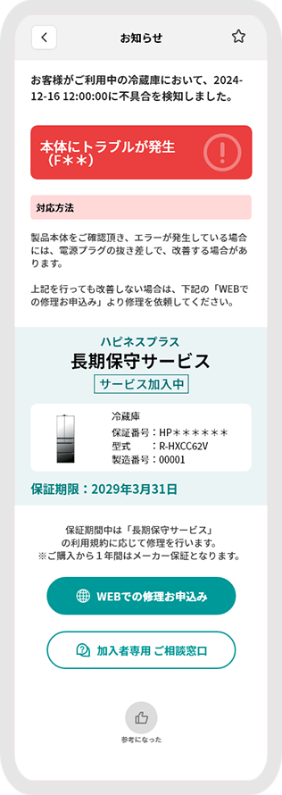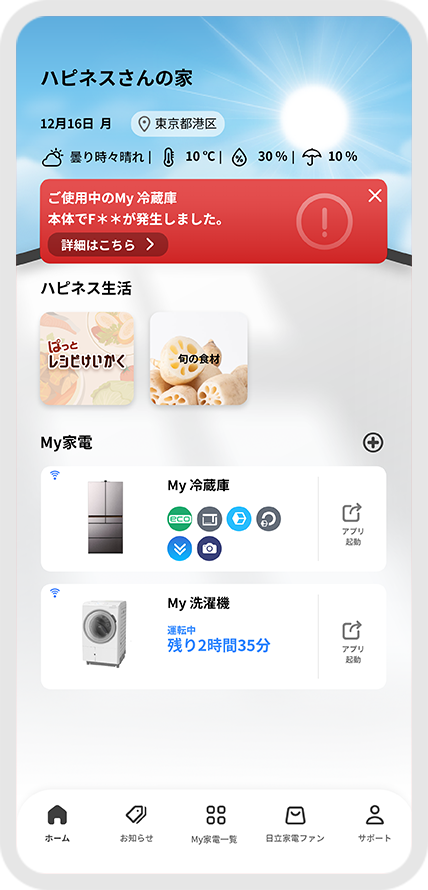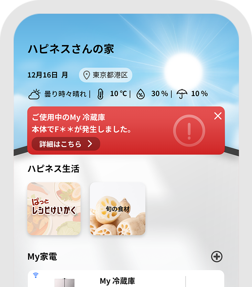 (*2)新機能「家電の救急アラート」の対応機種は、コネクテッド家電の冷蔵庫(R-KC11Rは未対応)、洗濯機となります。本機能のご利用には事前に「ハピネスアップ」と製品本体のペアリング(連携)が必要です。