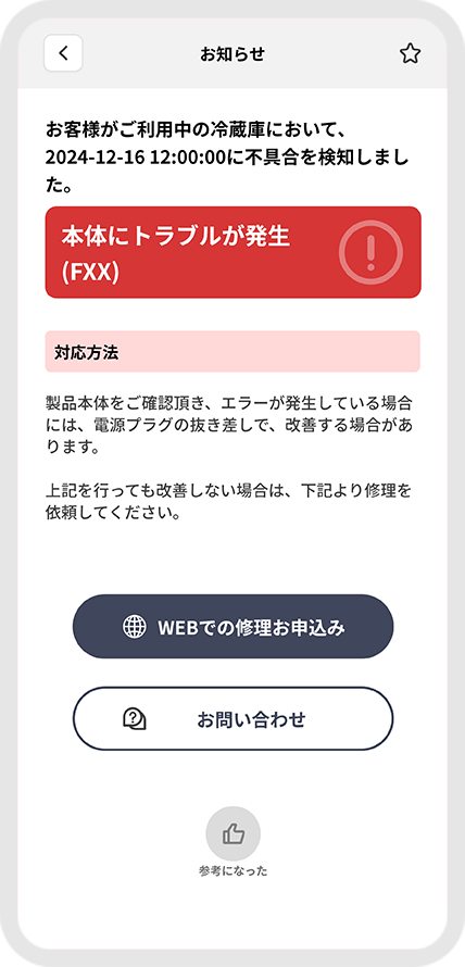 (*4)製品本体の不具合とは、お客さまでの対処方法が限られており、修理作業者による点検や修理が必要と思われる症状です。製品においては、以下のように表示されます。