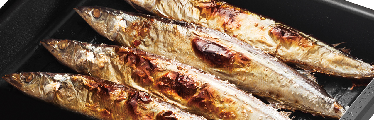 比較条件(当社調べ):さんま4尾、「オート調理:丸焼き(中)」と「手動グリル(強)」調理時に発生するピーク時の煙の量および調理時の魚温度(中央)、波皿温度(溝付近)を比較。調理時間:丸焼き19分50秒。手動グリル23分30秒。食材の種類・量・鮮度などの調理状態により煙の発生量は異なります。