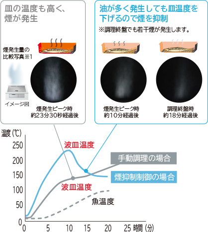 調理中に魚から出た油が皿に溜まり、皿の熱で焼けて煙になります。煙抑制制御は、魚の温度が高くなり魚から出る油の量が多くなる調理終盤の皿の温度を抑えることで、油の蒸発による煙の発生量を抑制します。
