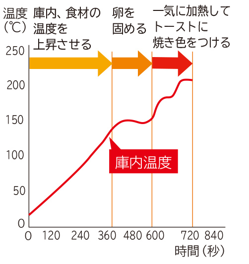 庫内中央部に熱が集中しないように平面状に配置されたヒーターが深皿および食材を上下から平面で加熱し、庫内全体の温度差を抑えます。焼きムラを抑えながら中までしっかり火を通すので焼き色きれいに、おいしく焼き上げます。表面だけで中は焼けていない、端まで焼けていない、部分的に焦げてしまうなど、焼きムラのお困りごとにお応えします。