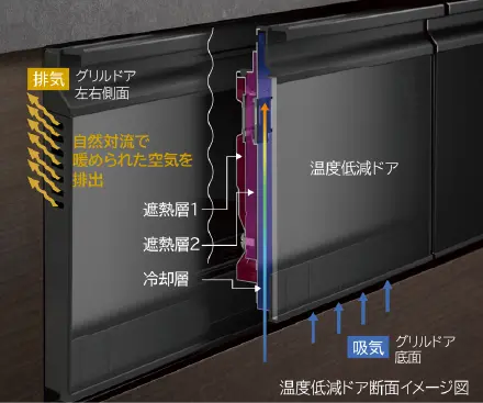 グリルドア底面から冷却空気を吸気。 冷却層内を通り、ドア側面の排気穴 から暖められた空気を排出。