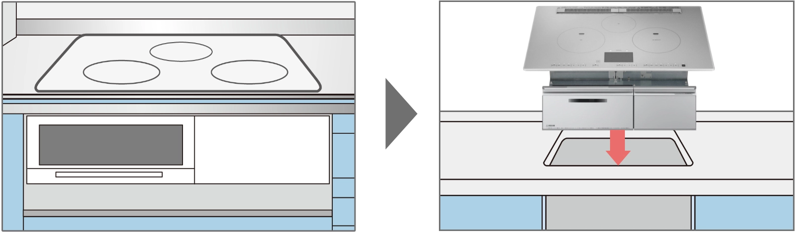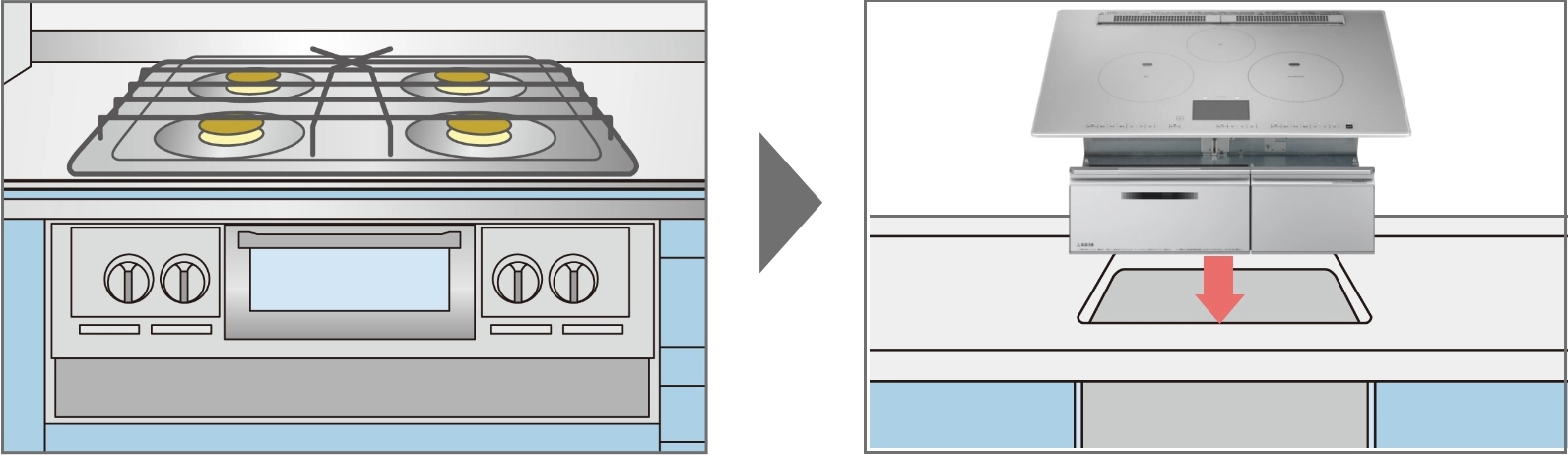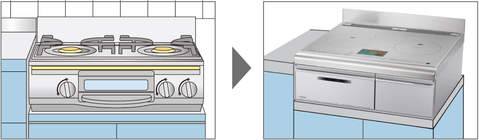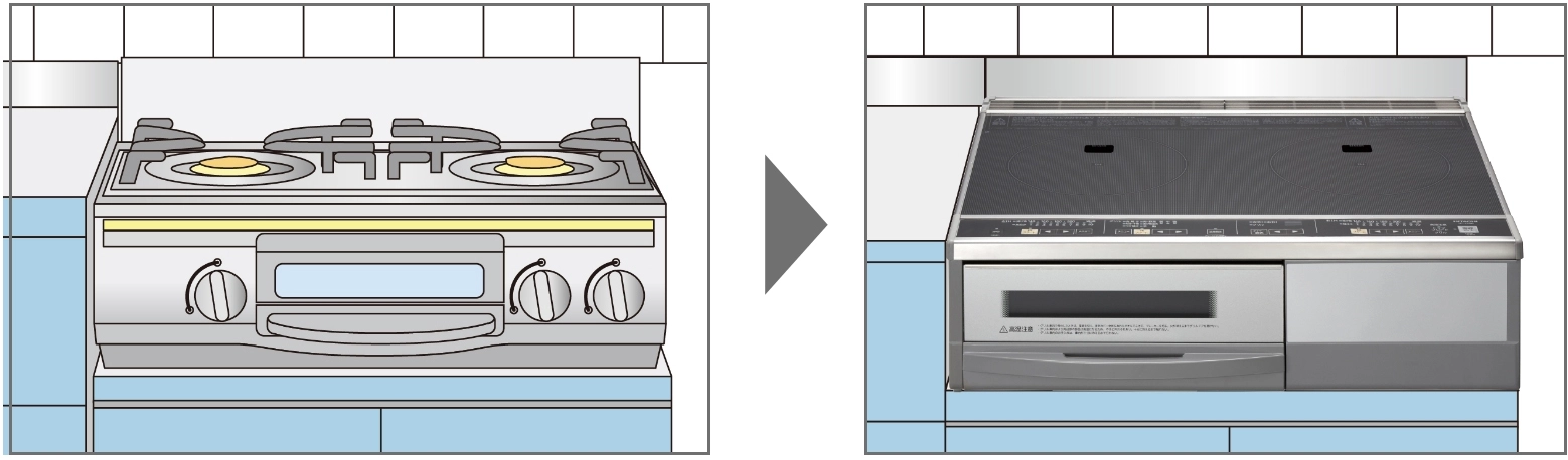 ※すべてのキッチンやガスコンロ・IH クッキングヒーターで対応できるわけではありません。また電気工事が必要になる場合があります。事前に取り替えができるか取扱店などにご確認ください。