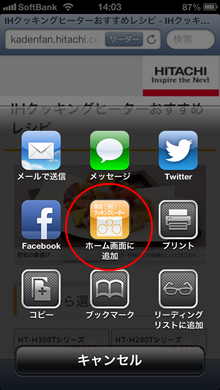 2. 操作メニューが表示されるので「ホーム画面に追加」ボタンをタップします。