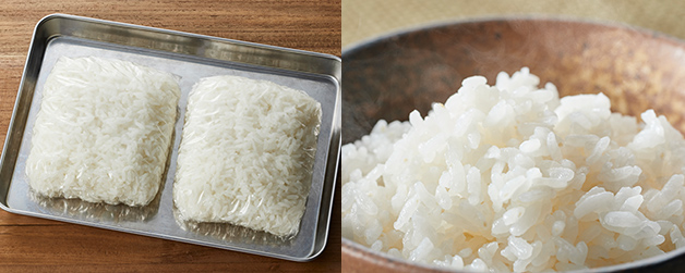 加熱せずに長時間浸し、しっかりとお米に吸水させてから一気に加熱。しっかり蒸らして、もちもちに炊き上げる。冷めてもおいしいごはんが炊ける。