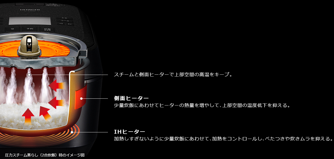 少量を炊くときは、内釜内の上部空間が広くなり温度が下がりがちに。そこで、スチームとヒーターで高温をキープし、少量でもおいしく炊き上げます。