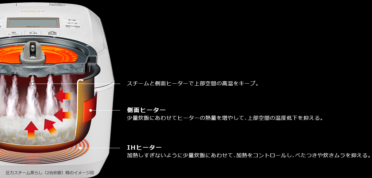少量を炊くときは、内釜内の上部空間が広くなり温度が下がりがちに。そこで、スチームとヒーターで高温をキープし、少量でもおいしく炊き上げます。