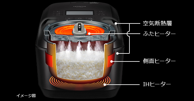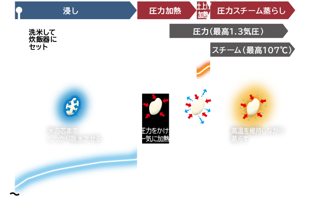 大火力で沸騰、圧力スチームで蒸らす 圧騰甘み炊き